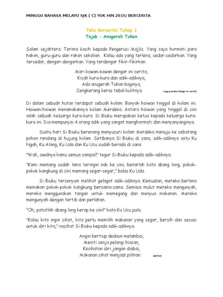 Panduan asas untuk guru sekolah menguruskan sukan bola sepak dan mengendalikan pertandingan bola sepak. Text of teks pertandingan bercerita tahun 1. Saya ellyana lumai dari kelas tahun . Pertandingan bercerita tahap 1 skbk 2020. Selamat pagi dan salam sejahtera semua. Assalamualaikum warahmatullahiwabarokatuh dan salam sejahtera. Pertandingan bercerita tahap 1 tahun 2020. Skrip pertandingan bercerita tahap 1 2017 onspaxt. Alex dudley · cerita murid tahun . Tarikh akhir pada 2 9 jun 2021. Teks juruacara majlis penutupan perkhemahan puteri islam daerah seremban 2014. Pautan muat turun teks bercerita. Teks cerita bm sang kacil dan tali pinggang sakti. Singa yang sombong (ellyana lumai).