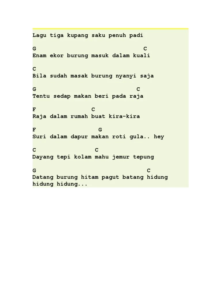 Lagu tiga kupangsagu penuh padienam ekor burungmasuk dalam kualibila sudah masakburung nyanyi sajatentu sedap makanberi pada rajaraja dalam . C lagu tiga kupang saku penuh padi g c enam ekor burung masuk dalam kuali c bila sudah masak burung nyanyi saja g c tentu sedap makan beri pada raja f c .